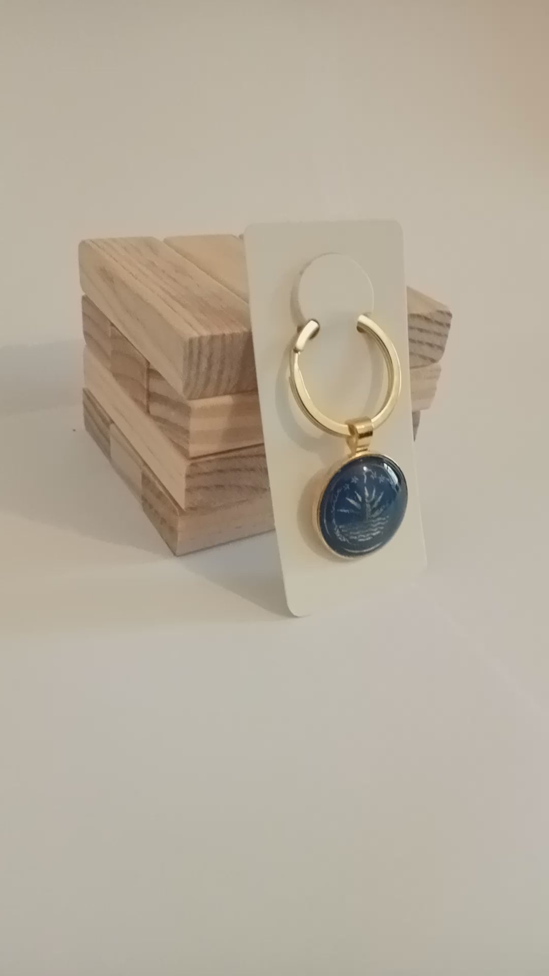 Golden Bangladeshi National Emblem Round Keyring on a Royal Blue background. Approximate size 25mm diameter. Keychain is made of metal alloy and glass.